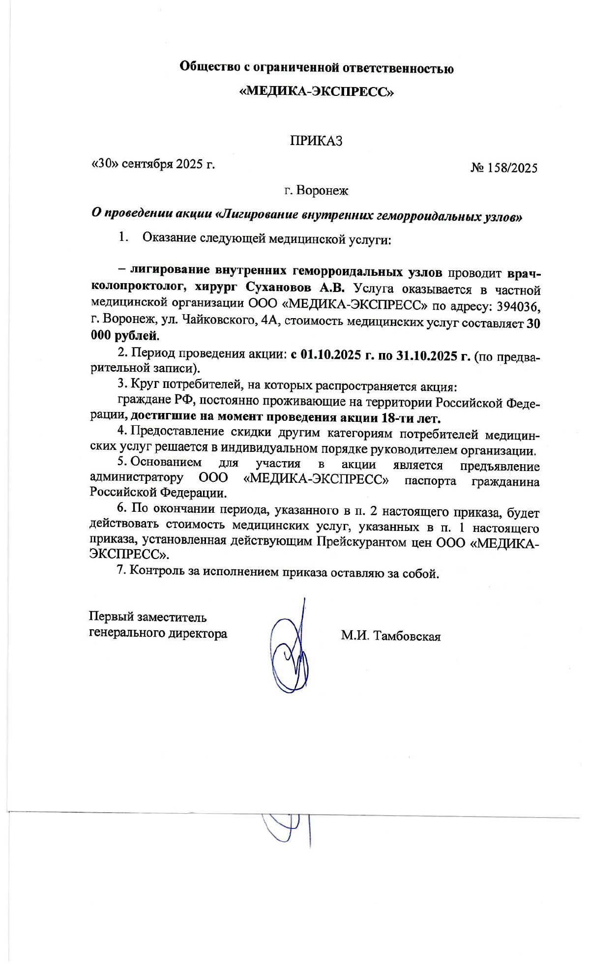 Приказ - О проведении акции "Лигирование внутренних геморроидальных узлов"