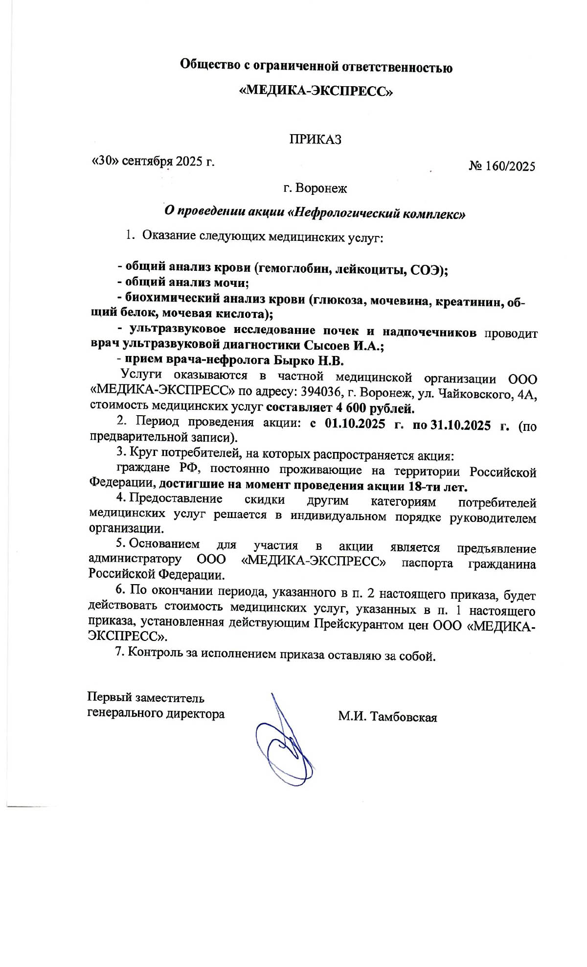 Приказ - О проведении акции «УЗИ сердца от 0 до 18 лет за 1200 рублей»