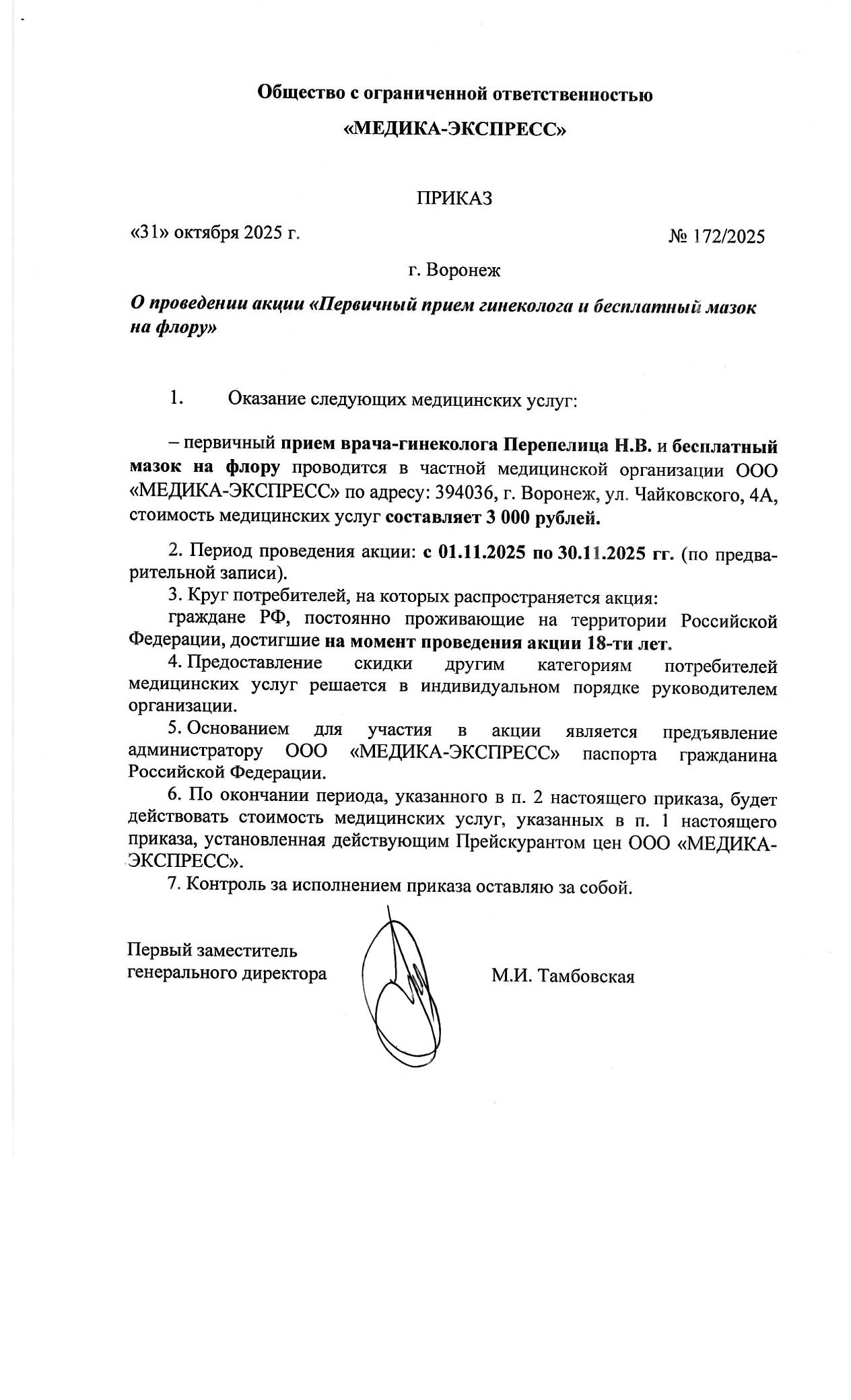 Приказ - О проведении акции "Первичный прием гинеколога и бесплатный мазок на флору"