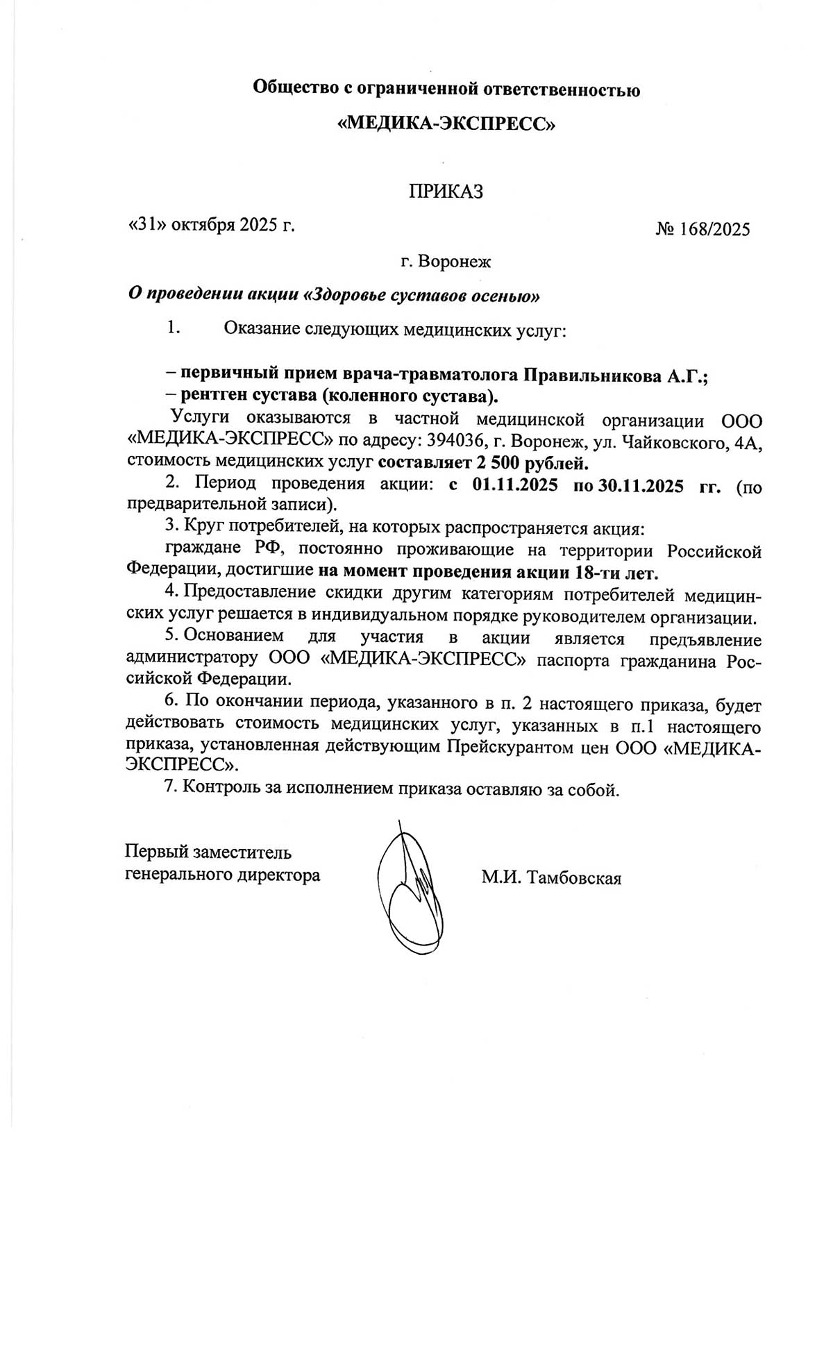 Приказ - О проведении акции "Комплексная помощь суставам"