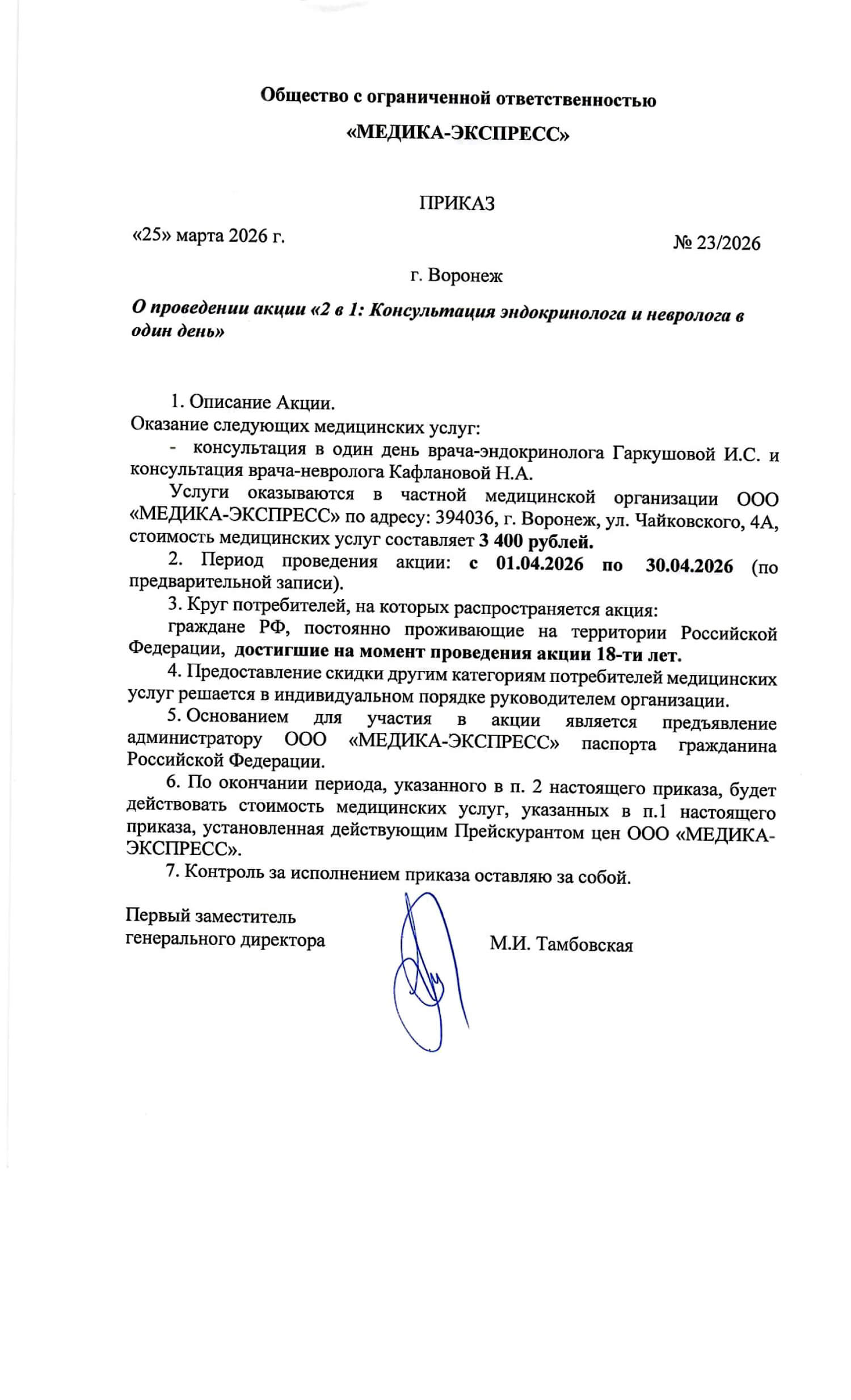Приказ - О проведении акции "Скидка 30% на прием невролога+УЗИ сосудов"