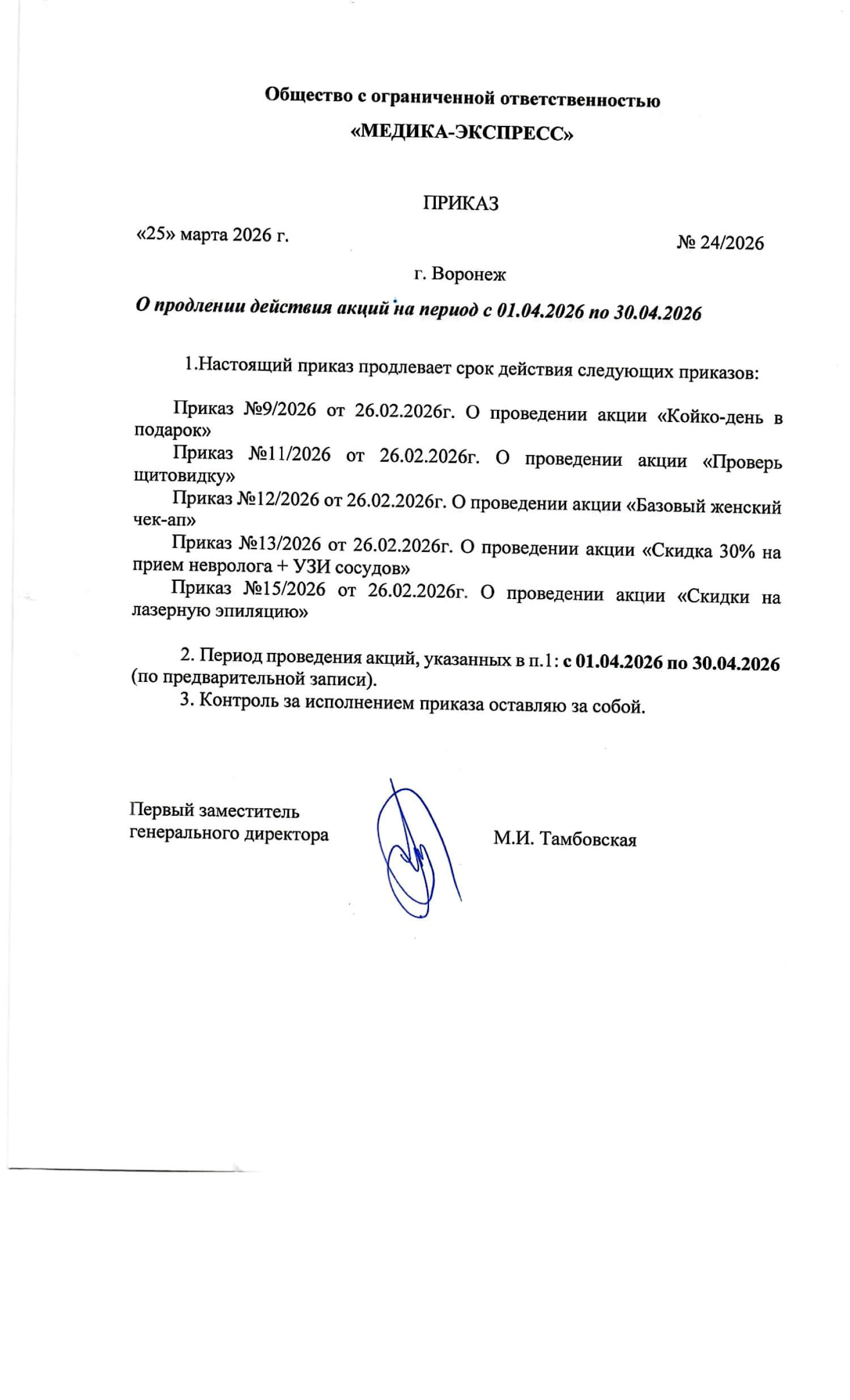 Приказ О продлении действия акций на период с 01.04.2026 по 30.04.2026