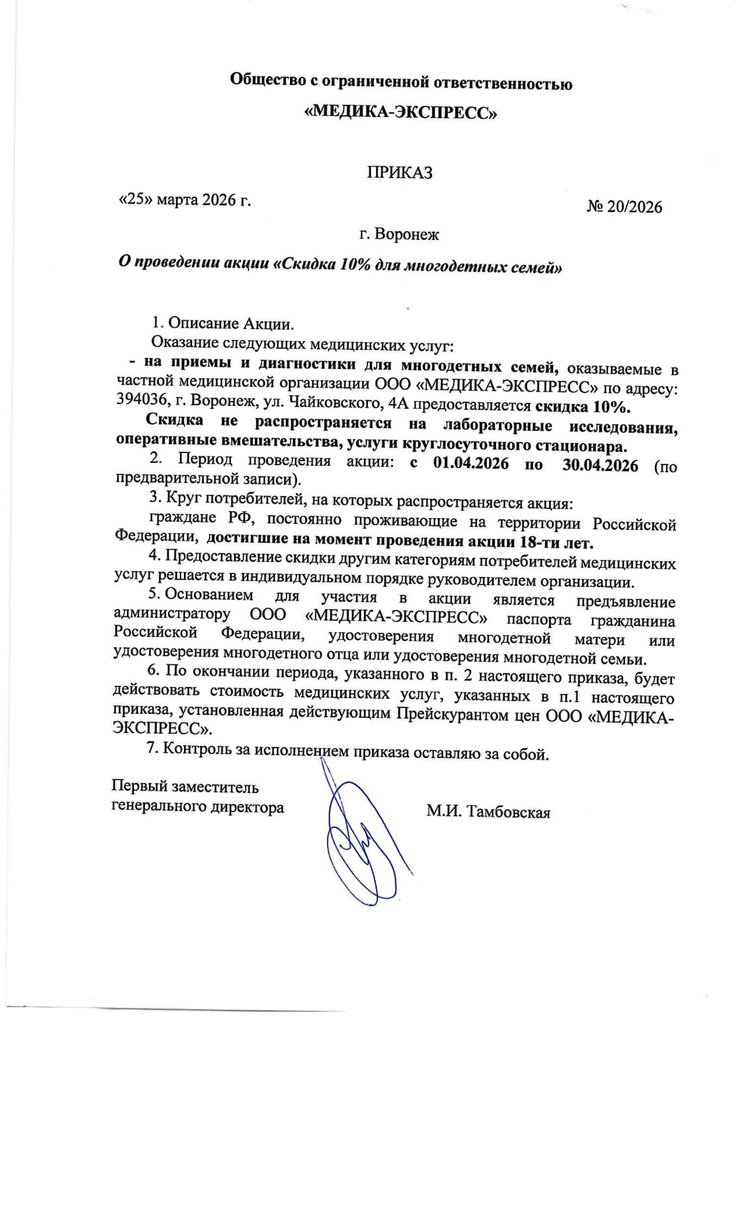 Приказ - О проведении акции "Скидка 10% для многодетных семей"