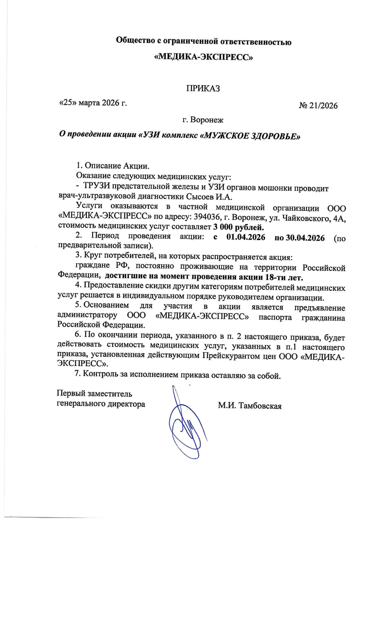 Приказ - О проведении акции "УЗИ комплекс МУЖСКОЕ ЗДОРОВЬЕ"