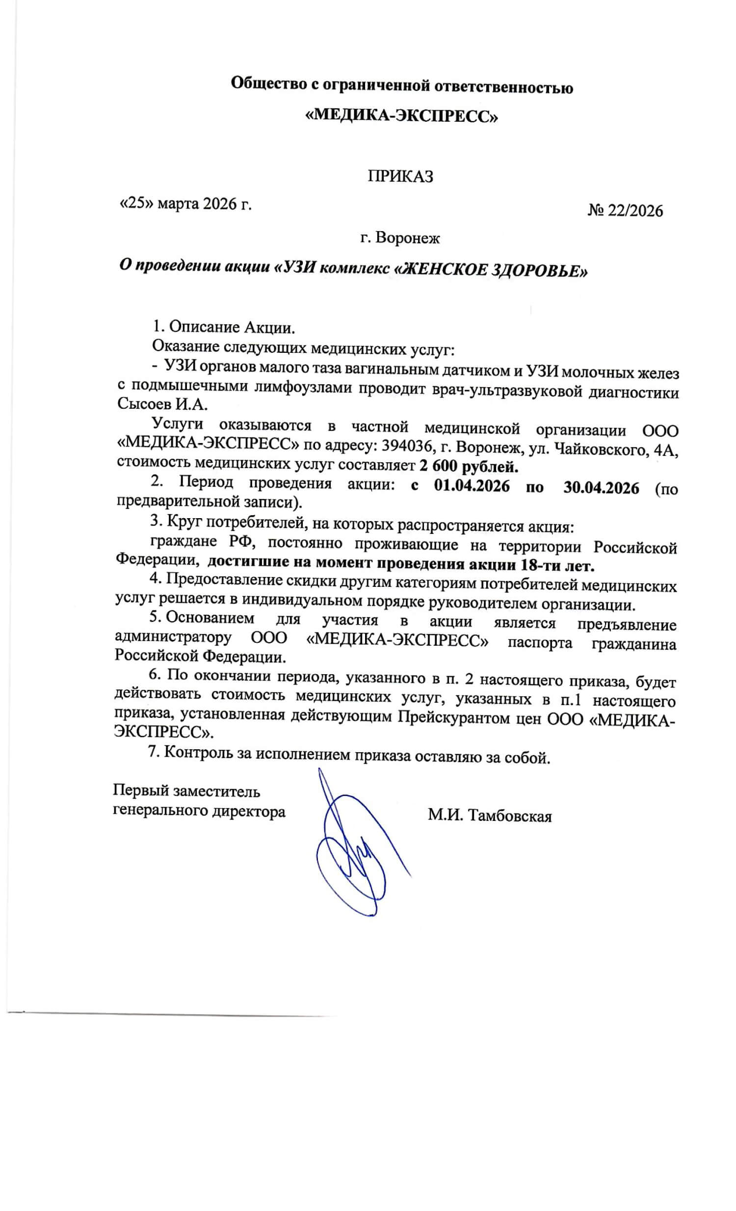 Приказ - О проведении акции "Базовый женский чек-ап"
